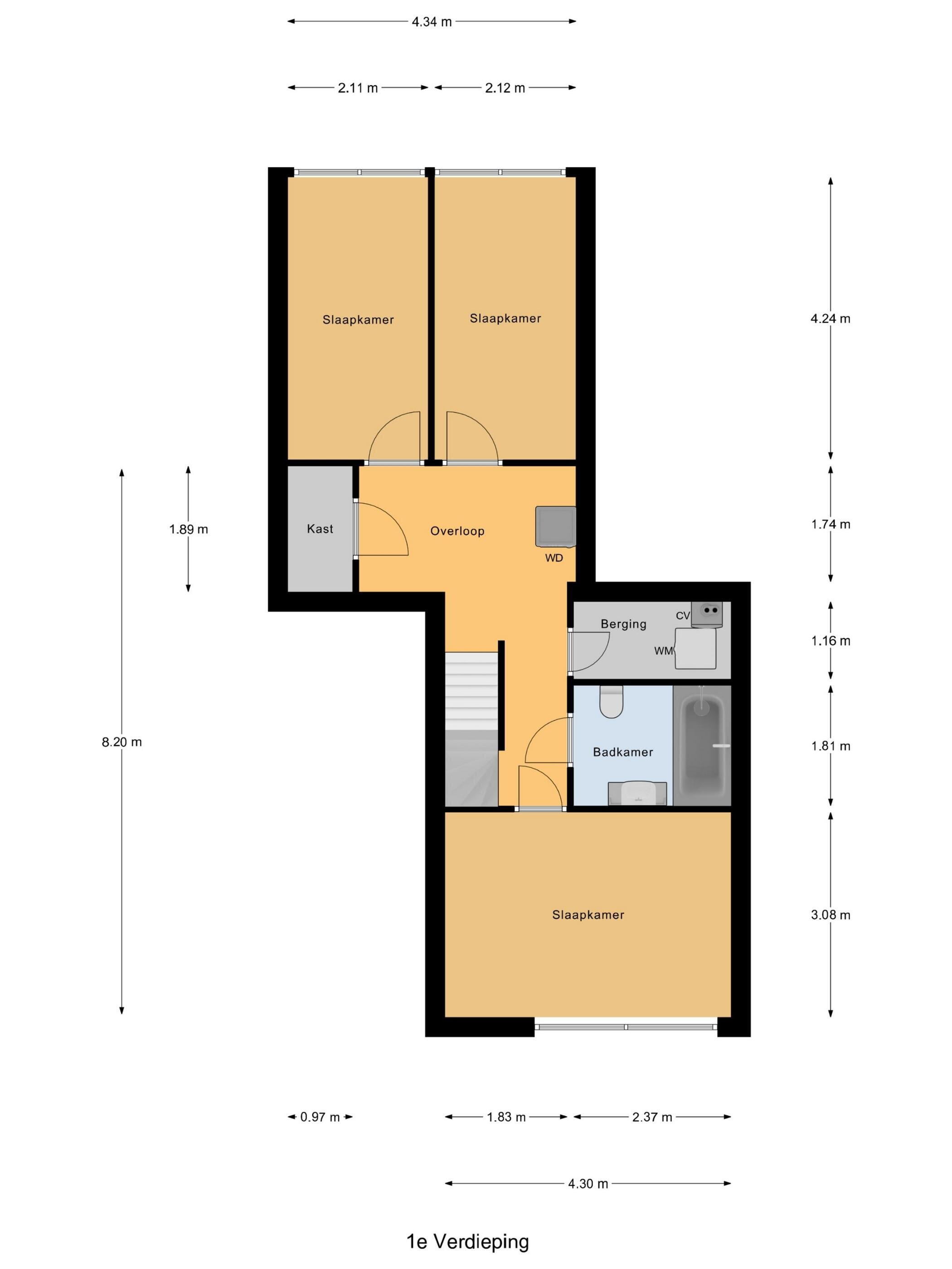 Op de eerste verdieping bevinden zich drie slaapkamers, een badkamer en een overloop.